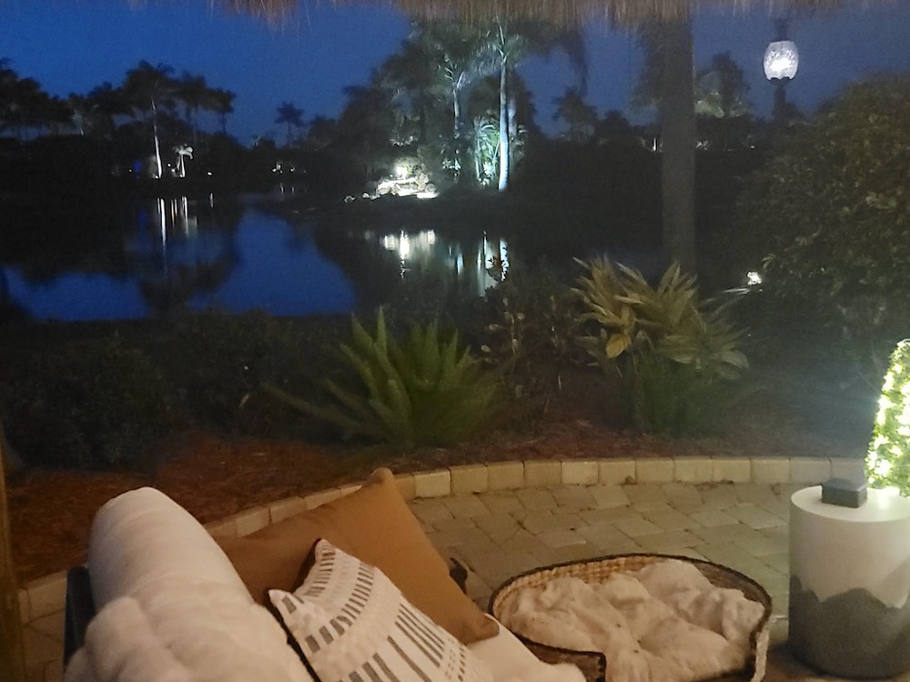 Simply Stunning Lot with Breathtaking Waterfall View! This exceptional pull-in lot offers a prime location, just steps away from the clubhouse and all community amenities. Surrounded by mature landscaping that ensures privacy on both sides, it provides the perfect retreat to sit and listen to the waterfall and watch the golfers tee off nearby. Built in 2021, the spacious tiki features automatic screens and a fully equipped, beautiful quartzite kitchen complete with an island featuring a waterfall edge. The elegant TV wall with a cozy fireplace insert adds to the luxurious feel. Included in the price are all furnishings, storage units, plus a top-of-the-line $5,000 Napoleon grill!