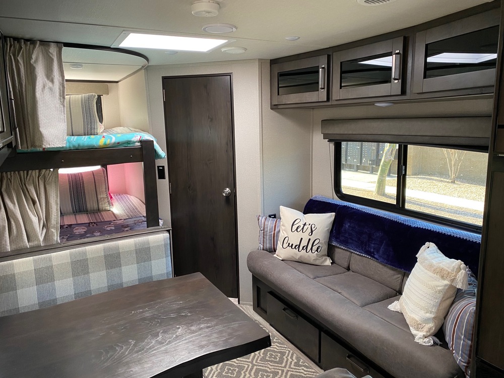The 247BH floor plan is great for families or groups of friends looking to explore the great outdoors without sacrificing the comforts of home. With sleeping space for up to 8 people, including a cozy queen bed, double bunk beds, and a convertible dinette, everyone can rest easy after a day of outdoor activities.