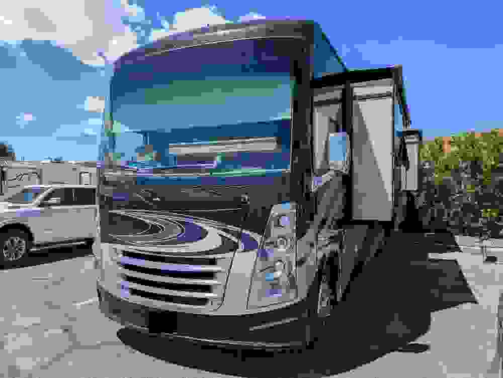 This sleek motorhome features a modern design with elegant finishes and thoughtful touches throughout. The living area is designed for ultimate relaxation, with plush seating, a large 4K flat-screen TV, and plenty of storage space. The kitchen is equipped with all the necessary appliances, including a residential refrigerator, microwave/convection oven, and a induction stove, making it easy to prepare delicious meals on the road.