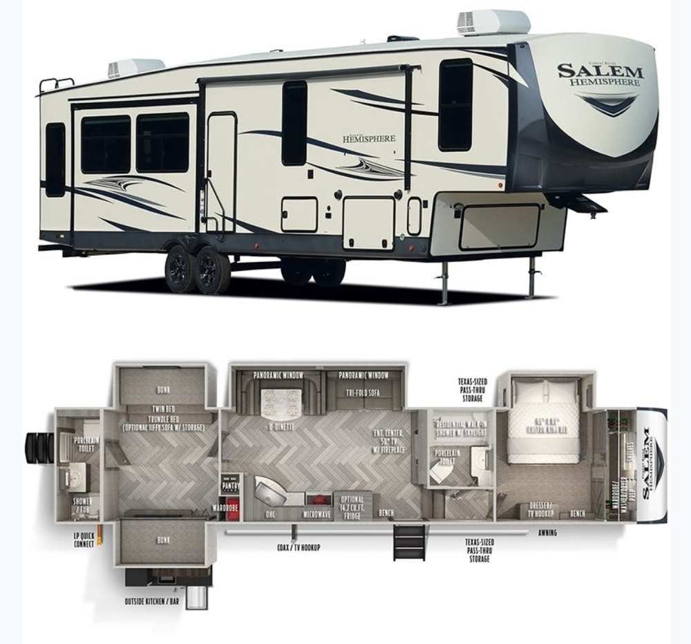 The 2020 Forest River Salem Hemisphere 356QB is a top-of-the-line fifth wheel trailer designed for luxury and comfort while on the road. With a spacious interior and modern amenities, this vehicle is perfect for families or groups looking to travel in style.
